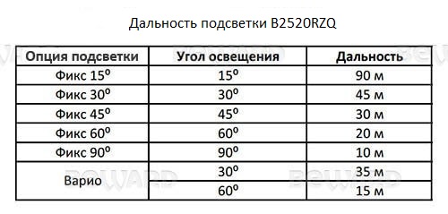 При покупке B2520RZQ реализована возможность выбора фиксированной или варифокальной ИК-подсветки. Угол освещения варифокальной ИК-подсветки изменяется дискретно через веб-интерфейс IP-камеры. Угол освещения фиксированной подсветки можно выбрать на этапе покупки камеры в зависимости от условий и задач видеонаблюдения (см. таблицу «Дальность подсветки и углы обзора»). ИК-светодиоды 3-го поколения, которыми оснащена сетевая камера B2520RZQ, отличаются увеличенным ресурсом работы и высокой стабильностью параметров в сравнении с обычными. Освещение распределяется равномерно, поэтому и изображение хорошо различимо целиком. Дальность подсветки достигает 90 м.